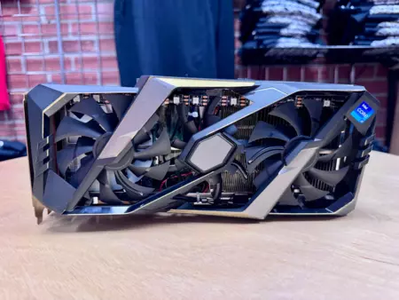 El proyecto, bautizado como ‘GeeFarce 5027POS Micro Computer’, ha llegado a las manos del canal especializado Gamers Nexus para su análisis. Sus creadores aprovecharon la carcasa de una tarjeta gráfica Gigabyte dañada durante el transporte y la transformaron en el chasis de un ordenador completamente funcional. El interior alberga las entrañas de un mini PC reconfigurado para encajar perfectamente en el espacio disponible.