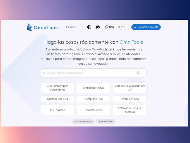 La web en cuestión es Omnitools.app y su apariencia sencilla y funcional se agradece mucho para no complicarse: un buscador arriba del todo si tienes claro a lo que vas, una pequeña lista de funciones habituales y más abajo, categorías por las que navegar. Si cambias el idioma a 'Español', más fácil todavía entender qué hacen sus más de 100 funciones (eso sí, la traducción es parcial y conforme avanzas es habitual encontrarse cosas en inglés).