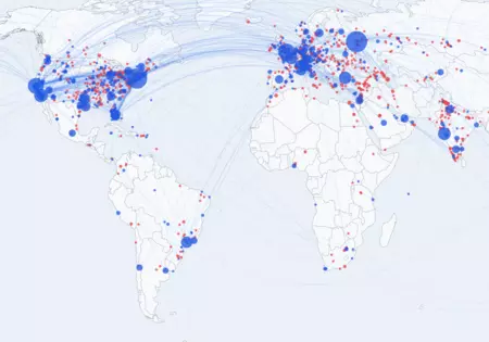 Billionaire Migration es un mapa interactivo que recoge esa lista de milmillonarios para visionar el movimiento migratorio de la gente más rica desde su ciudad de nacimiento hasta la última residencia conocida. Si vamos desplazándonos y haciendo zoom por diferentes zonas del planeta encontramos lugares que aglutinan una gran densidad de puntos. Eso sí, mientras que en lugares como Oriente Medio o India hay más puntos rojos (el color elegido para el nacimiento), otros como la costa este de Estados Unidos, Londres o Suiza aglutinan puntos azules (la residencia).